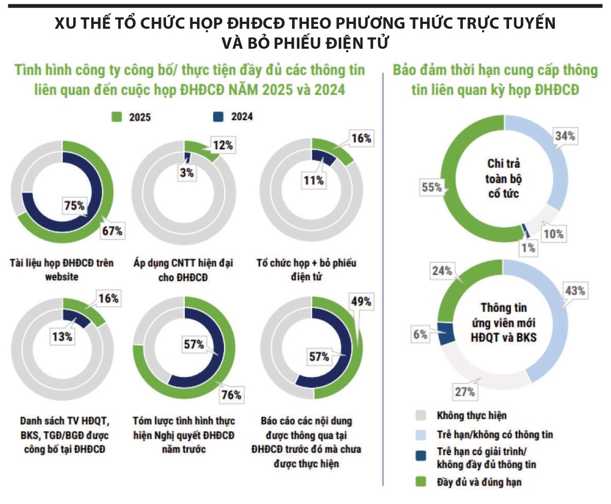 Nhóm doanh nghiệp dẫn đầu tiếp tục thể hiện sự chủ động vượt chuẩn: Công bố sớm tài liệu họp, triển khai kênh lấy ý kiến cổ đông trước kỳ họp và minh bạch tiêu chí lựa chọn ứng viên. Những nỗ lực này phản ánh văn hóa quản trị tiến bộ và cách ứng xử tôn trọng cổ đông - yếu tố vốn được xem là thước đo quan trọng trong các bộ tiêu chí quốc tế.