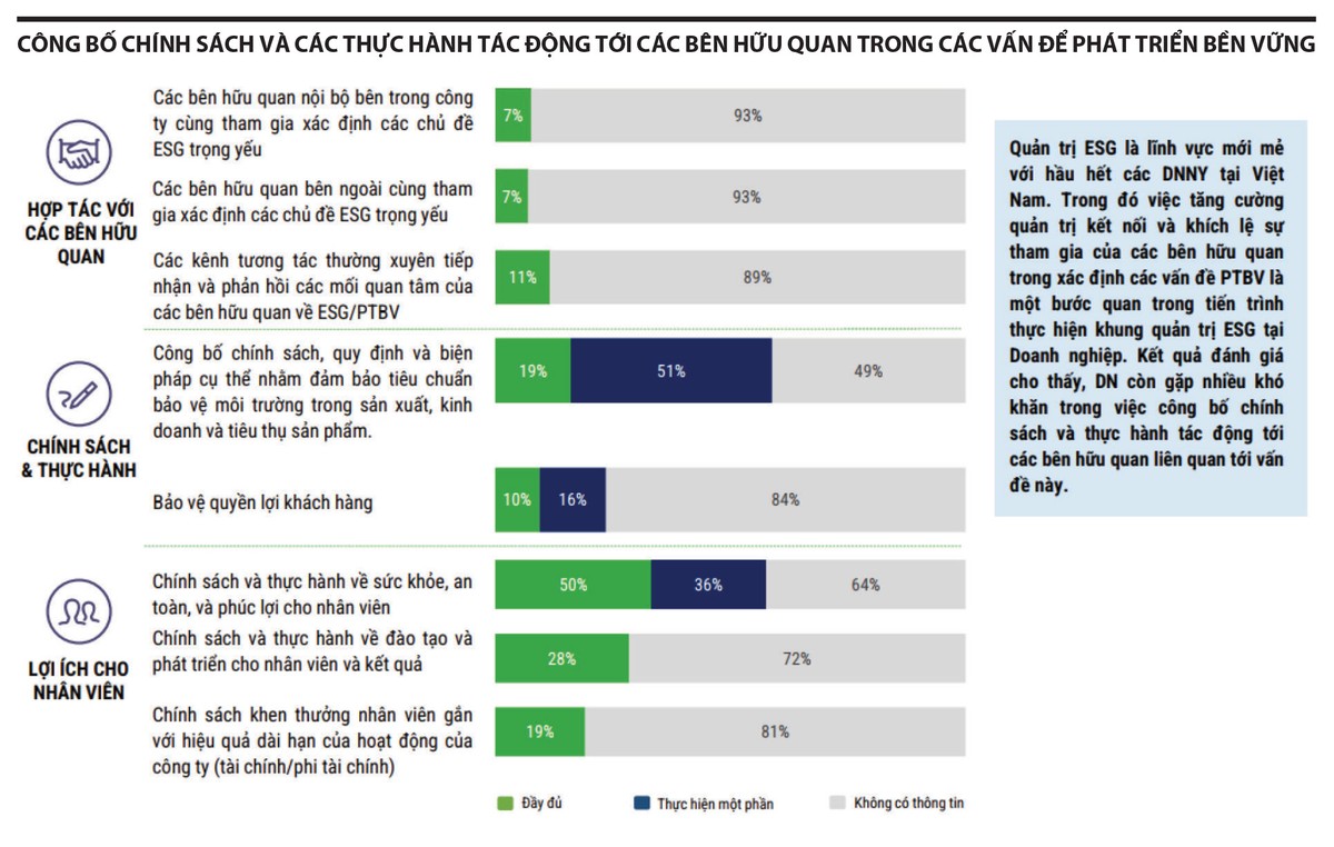 Số lượng doanh nghiệp thực hiện kiểm định độc lập đối với các nội dung như phát thải khí nhà kính, quản lý rủi ro khí hậu hay tuân thủ chính sách môi trường tăng lên đáng kể. Điều này cho thấy ESG đã dần trở thành phần không thể thiếu trong hệ thống quản trị, thay vì chỉ mang tính hình thức như những năm đầu triển khai.