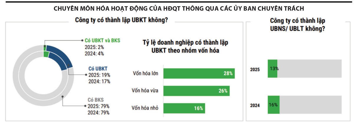 Nhiều doanh nghiệp đã thành lập các ủy ban chuyên trách như Ủy ban lương thưởng, Ủy ban nhân sự hoặc Ủy ban kiểm toán với sự tham gia của thành viên độc lập, giúp nâng cao chất lượng giám sát và phân tách rõ vai trò trong HĐQT. Một số doanh nghiệp thực hiện đánh giá định kỳ hiệu quả hoạt động của HĐQT, công khai tiêu chí lựa chọn ứng viên và thực hiện tự đánh giá theo Bộ Nguyên tắc QTCT Việt Nam (VNCG Code), phù hợp với thông lệ tốt trong khu vực.