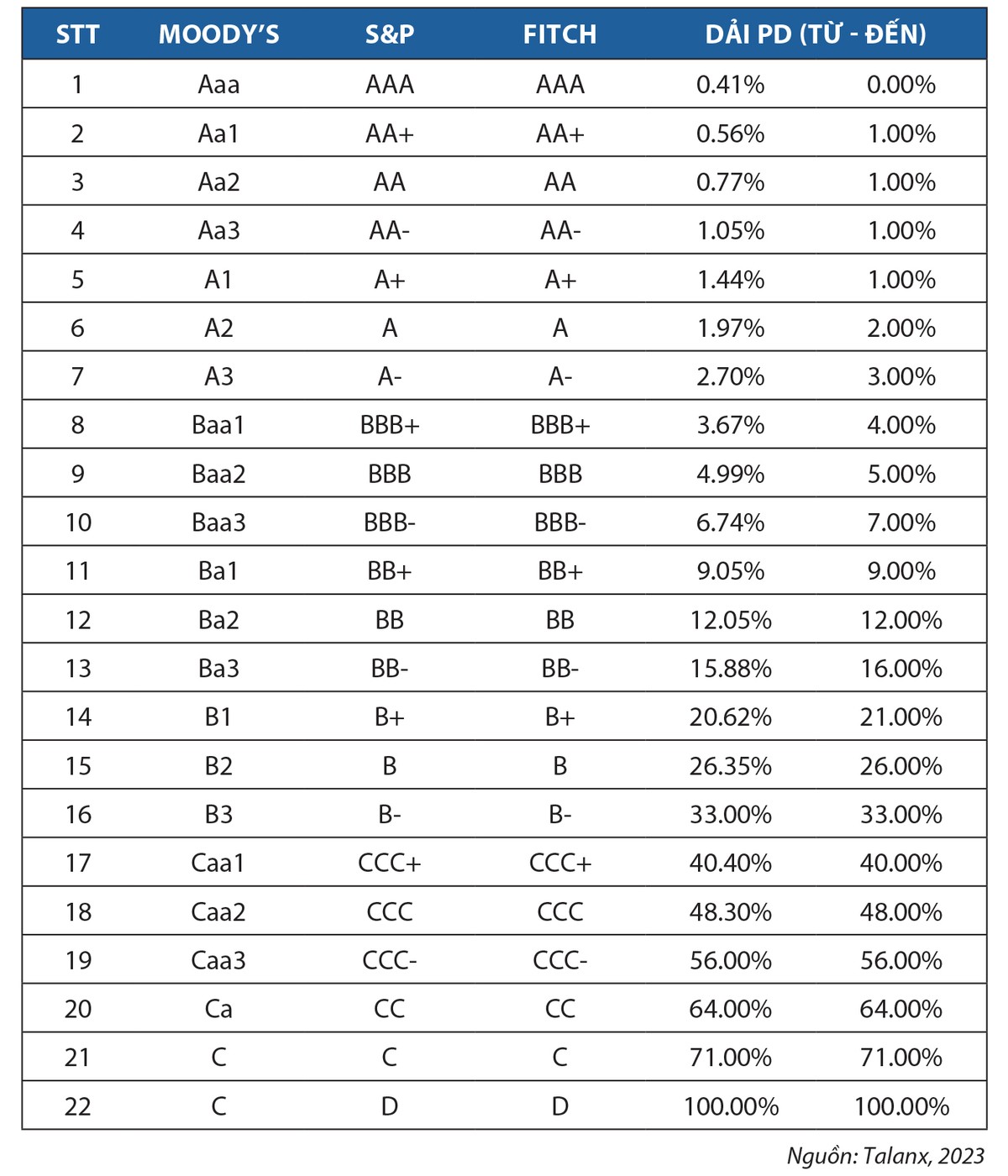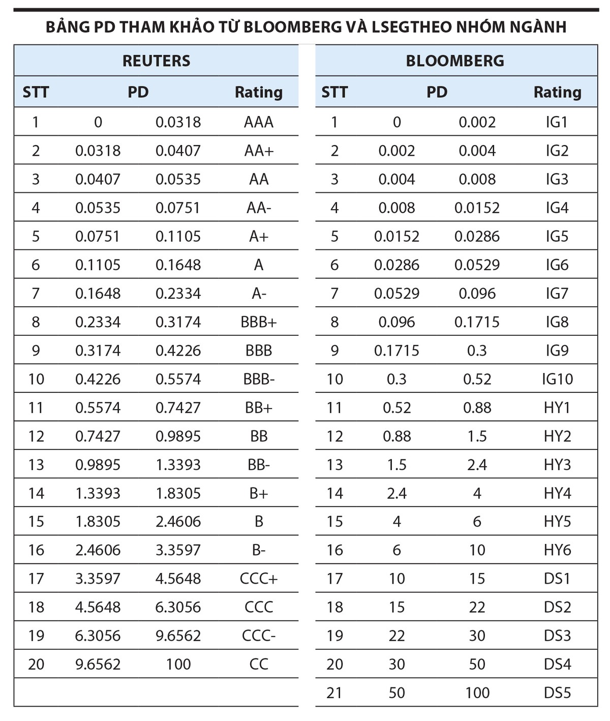 Ví dụ, Moody, Fitch, S&P có cung cấp thông tin về xếp hạng tín nhiệm và PD. Theo đó, nhà đầu tư có thể tự xây dựng phương pháp nội bộ thông qua các chỉ tiêu định lượng và định tính để tính ra xếp hạng cho tổ chức tín dụng, sau đó đối chiếu với xếp hạng mà các tổ chức quốc tế công bố để điều chỉnh.