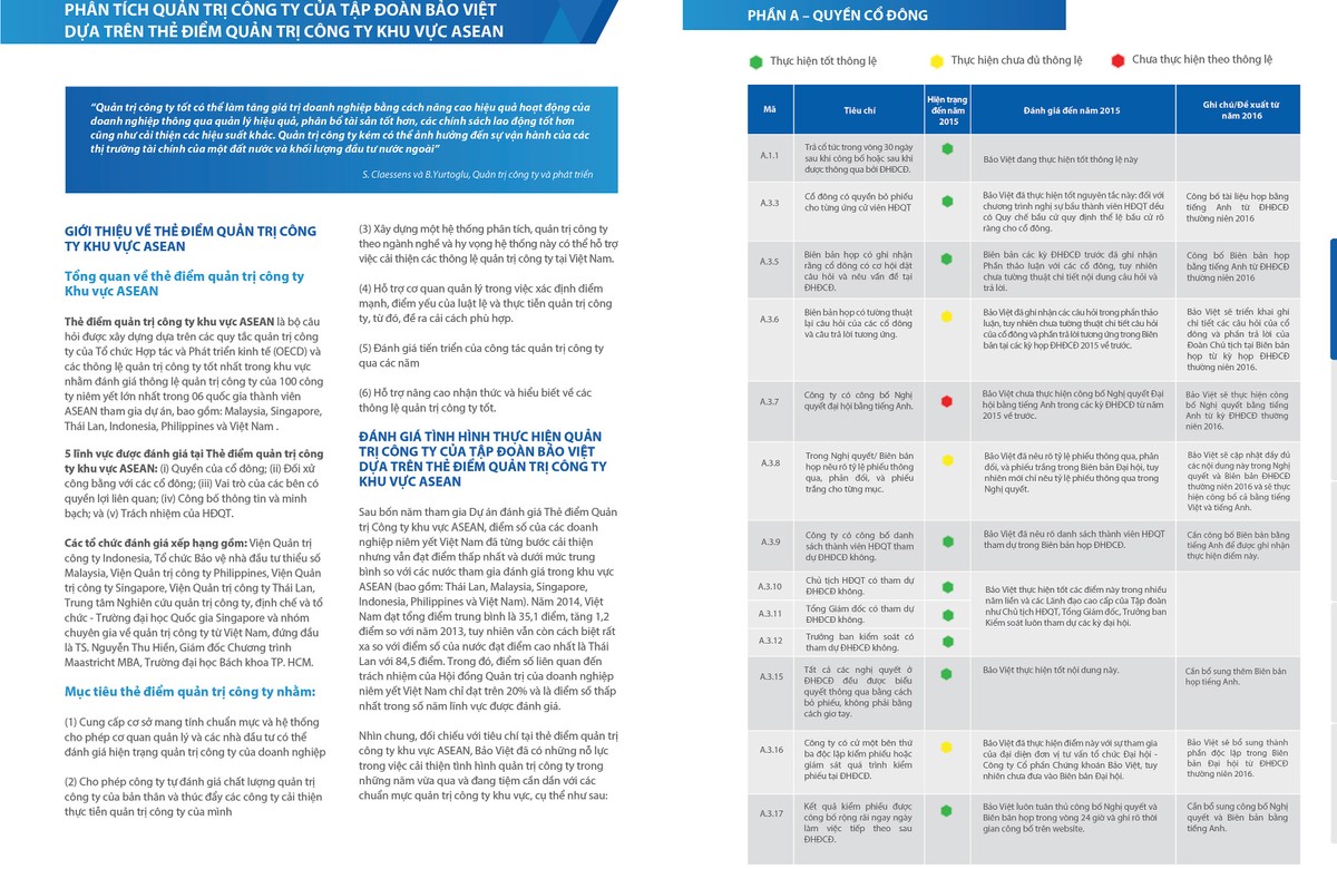 Báo cáo Tích hợp năm 2015 của Tập đoàn Bảo Việt được lập trên cơ sở vận dụng Thẻ điểm quản trị công ty khu vực ASEAN