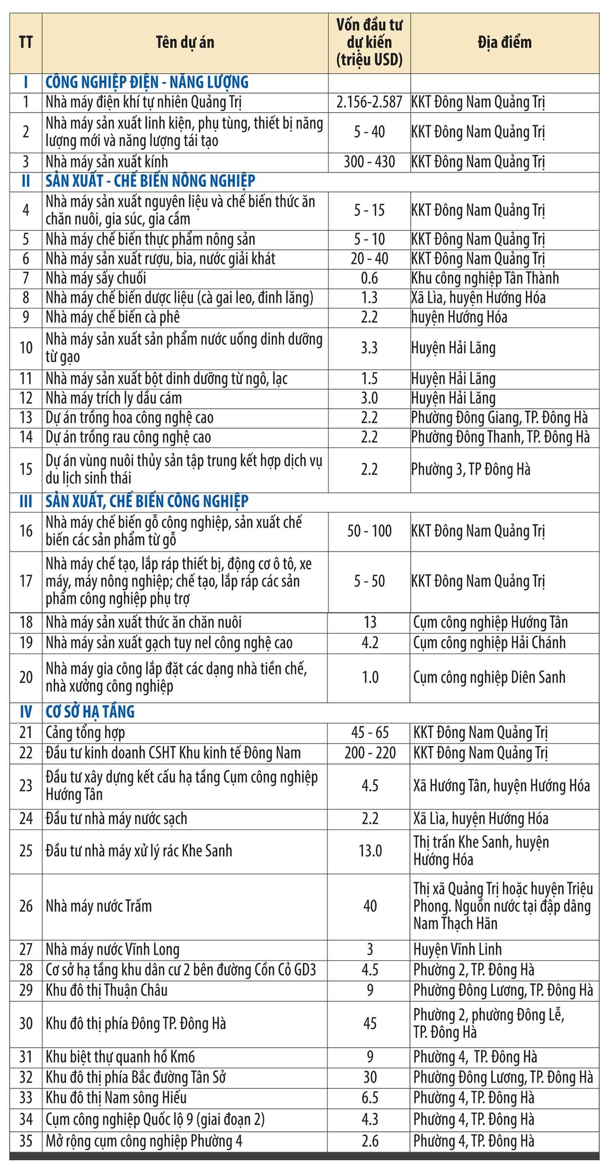 DANH MỤC MỘT SỐ DỰ ÁN ƯU TIÊN KÊU GỌI ĐẦU TƯ CỦA TỈNH QUẢNG TRỊ NĂM 2022, CÓ TÍNH ĐẾN NĂM 2025