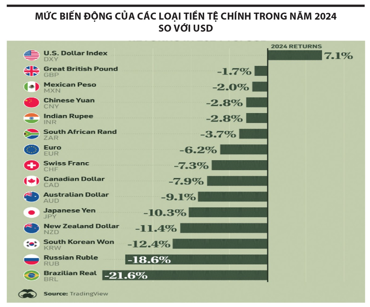 Năm 2024 có thể xem là năm của USD, khi đồng bạc xanh phô trương sức mạnh, khiến đa phần các đồng tiền khác đều giảm giá bất ngờ, bao gồm cả việc đồng euro giảm xuống gần mức ngang giá USD. Điều này phản ánh sức mạnh kinh tế của Hoa Kỳ trong bối cảnh tăng trưởng chậm chạp của khu vực đồng euro và hoạt động kinh tế ảm đạm ở Trung Quốc. Thêm vào đó, việc Tổng thống Trump trở lại Nhà Trắng đã thúc đẩy đồng USD tăng giá do kỳ vọng lạc quan về nền kinh tế Mỹ trong thời gian tới và tác động của các biện pháp thuế quan mà ông Trump dự kiến áp dụng.