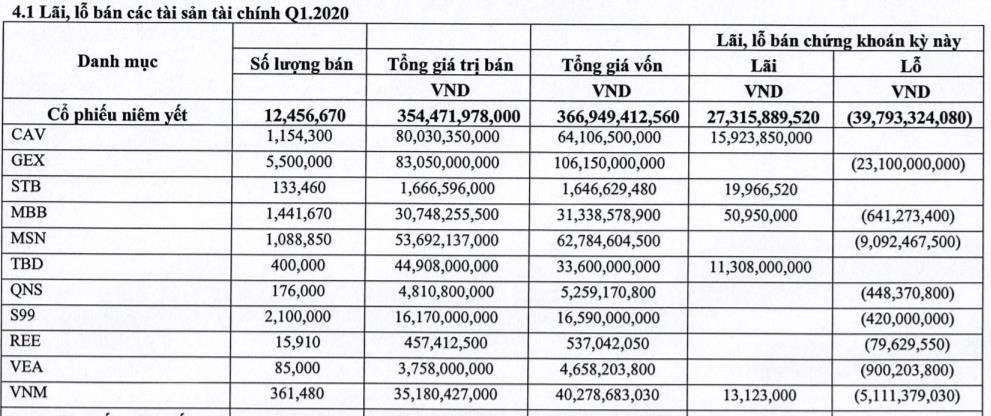 BCTC EVS cũng cho thấy, trong kỳ, tự doanh công ty đã cắt lỗ ở nhiều cổ phiếu, trong đó khoản cắt lỗ lớn nhất là ở cổ phiếu GEX lỗ 23,5 tỷ đồng khi bán ra 5,5 triệu cổ phiếu; lỗ 9 tỷ đồng khi bán ra hơn 1 triệu cổ phiếu MSN và lỗ 5,1 tỷ đồng khi bán hơn 360.000 cổ phiếu VNM.