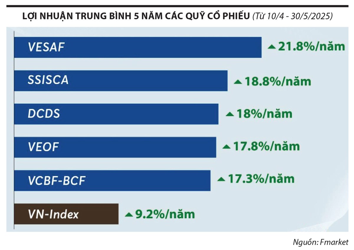 Dữ liệu từ Fmarket, nền tảng phân phối chứng chỉ quỹ đang tập trung nhiều quỹ mở nhất tại Việt Nam cho thấy, trong chu kỳ 5 năm, phần lớn các quỹ mở đều ghi nhận mức tăng trưởng NAV ấn tượng, bất chấp các pha điều chỉnh mạnh của thị trường. Dẫn đầu mốc lợi nhuận này là Quỹ VESAF với lợi nhuận 21,8%/năm. Xếp sau lần lượt là SSISCA (18,8%), DCDS (18%/năm), VEOF (17,8%/năm) và VCBF-BCF (17,3%/năm), vượt trội so với mức tăng trưởng chỉ 9,2%/năm của VN-Index trong cùng giai đoạn (tính đến ngày 30/5/2025).