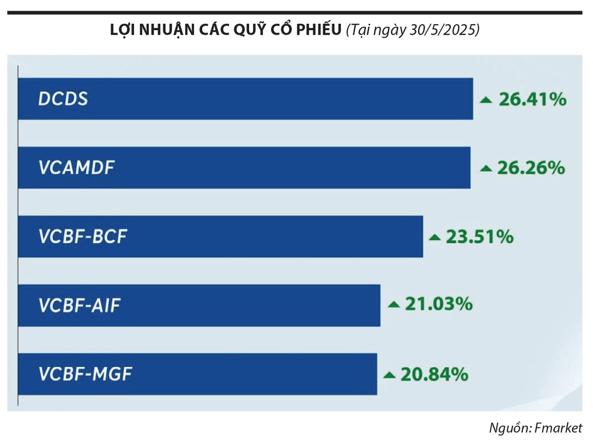 Tính đến hết tháng 5/2025, chỉ số VN-Index đã lấy lại toàn bộ số điểm đã mất trong giai đoạn biến động do lo ngại thuế quan. Trên nền thị trường tích cực, các quỹ mở cổ phiếu cũng phục hồi từ vùng đáy, chuyển sang mức lợi nhuận dương.
