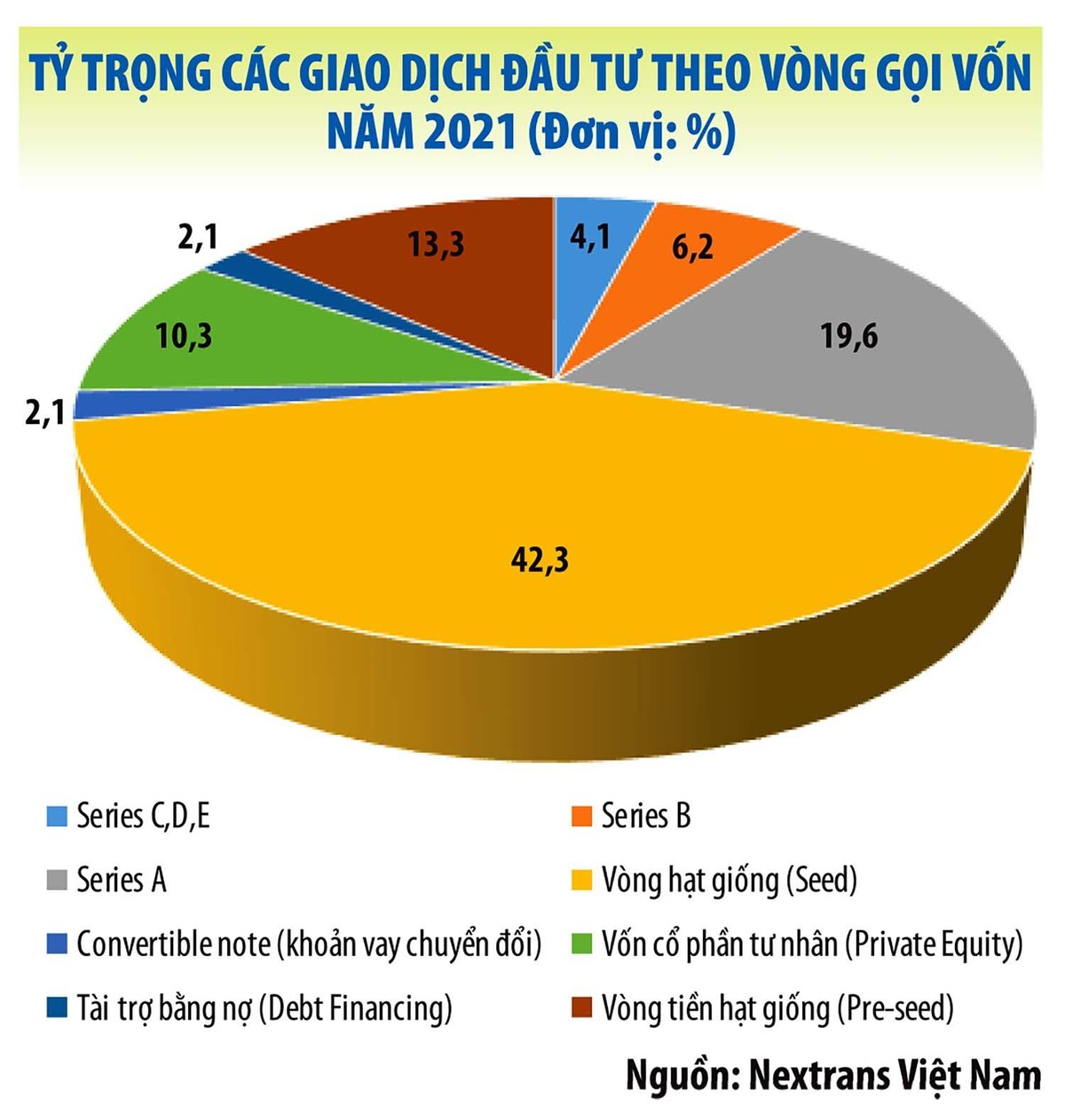 Năm 2021, khi các quỹ đầu tư và start-up ngày càng thích nghi với quy trình làm việc trực tuyến, hàng loạt “thương vụ” đã được chốt ngay cả trong thời điểm giãn cách xã hội để phòng, chống dịch. Đặc biệt, trong nửa cuối năm 2021, các thương vụ gọi vốn thành công liên tiếp được công bố, trong đó, phần lớn vẫn là các vòng tiền hạt giống (Pre-seed), vòng hạt giống (Seed), Pre-series A và Series A với số vốn đầu tư dao động từ 500.000 USD đến 3 triệu USD. Các thương vụ chủ yếu thuộc lĩnh vực fintech, edtech (công nghệ giáo dục) và thương mại điện tử.