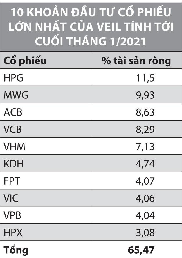 Giữ ngôi vị quỹ đầu tư lớn nhất thị trường chứng khoán Việt Nam với giá trị tài sản ròng hơn 1,7 tỷ USD, Quỹ VEIL do Dragon Capital quản lý cũng tăng trưởng âm trong tháng 1/2021. Cụ thể, hiệu suất đầu tư của Quỹ âm 3,61% trong tháng đầu năm.