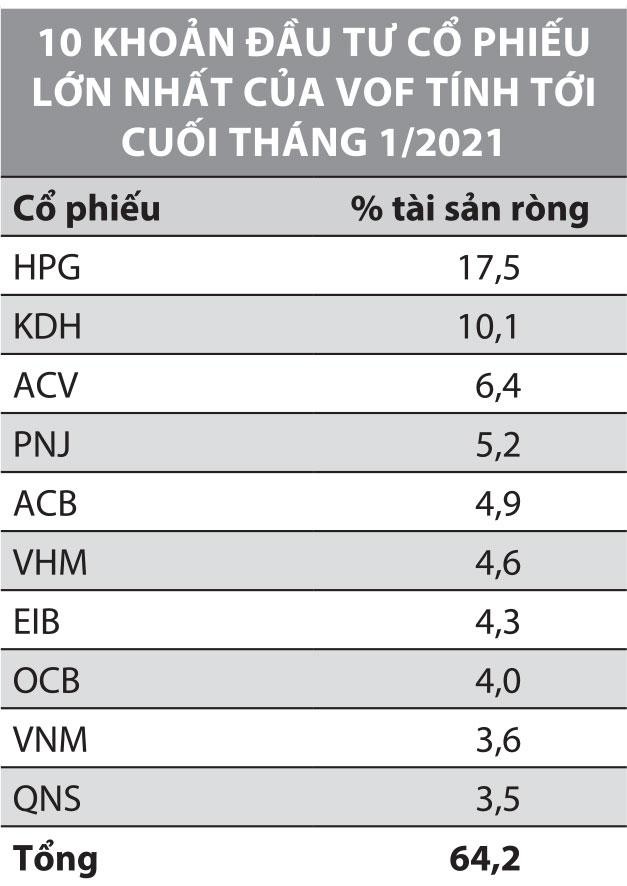 VOF, quỹ đầu tư do VinaCapital quản lý, đầu tư mạnh vào lĩnh vực vốn cổ phần tư nhân, nhưng trước sức hấp dẫn của thị trường chứng khoán đã giảm tỷ trọng các cổ phiếu ngoài sàn. Tính tới cuối tháng 1/2021, tỷ trọng đầu tư vốn cổ phần tư nhân và cổ phiếu chưa niêm yết của VOF lần lượt là 15,5% và 10,6%, trong khi từng chiếm tới 26,9% và 13,3% vào tháng 3/2020.