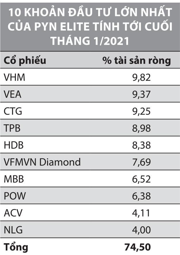Đáng chú ý, ngay trong thời điểm đầy biến động đầu năm 2021, PYN Elite đã dồn lực mua cổ phiếu VHM, đưa cổ phiếu này trở thành khoản đầu tư lớn nhất danh mục. Theo đó, trong 3 tháng tính tới tháng 1/2021, từ việc không nằm trong Top 10 khoản đầu tư lớn nhất, cổ phiếu VHM đã được nâng lên chiếm 9,82% danh mục đầu tư, trị giá 56,2 triệu Euro (tương đương 1.500 tỷ đồng).