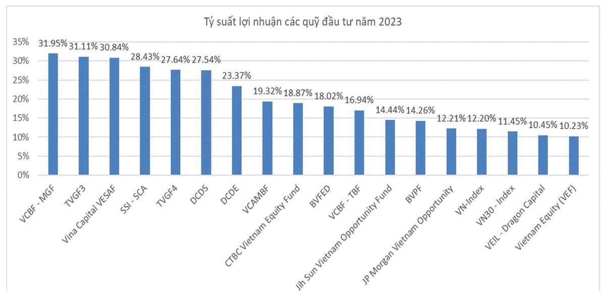 Năm 2023, Quỹ đầu tư tăng trưởng VCBF (VCBF-MGF) đạt lợi nhuận 32%, cao hơn nhiều mức tăng 12,2% của chỉ số VN-Index.
