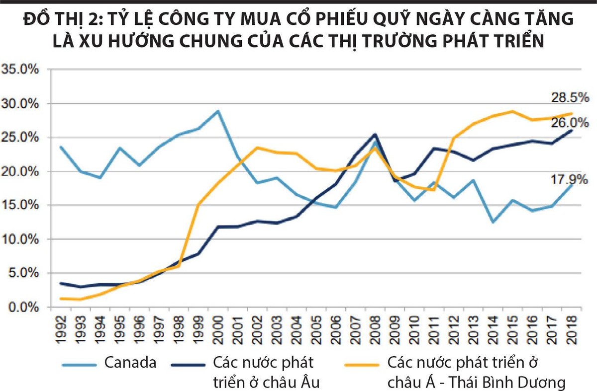 Các số liệu của nghiên cứu này cũng cho thấy, số lượng công ty mua cổ phiếu quỹ tăng lên là xu hướng chung ở các thị trường phát triển cũng như các nước châu Á (xem đồ thị 2) và thị trường chứng khoán Mỹ phục hồi tốt hơn sau giai đoạn suy giảm nhờ các doanh nghiệp mua cổ phiếu quỹ.