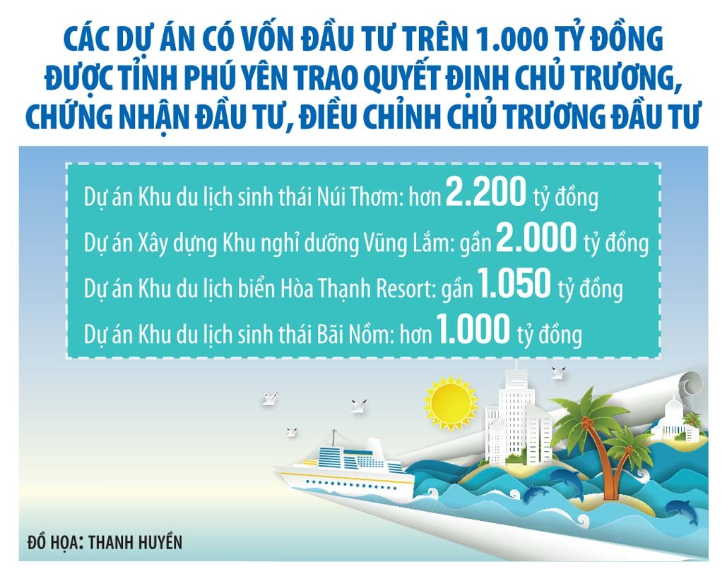 Các dự án có vốn đầu tư trên 1.000 tỷ đồng gồm: Dự án Khu du lịch sinh thái Núi Thơm (Công ty cổ phần Sao Phương Bắc Phú Yên); Dự án Xây dựng Khu nghỉ dưỡng Vũng Lắm (Công ty cổ phần Everland Phú Yên); Dự án Khu du lịch biển Hòa Thạnh Resort (Công ty TNHH Khu du lịch biển Hòa Thạnh Resort); Dự án Khu du lịch sinh thái Bãi Nồm (Công ty cổ phần Đầu tư và Kinh doanh nhà Việt An Phú Yên).
