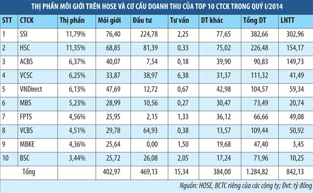 10 CTCK có thị phần lớn nhất trên Sở GDCK TP. HCM (HOSE) chiếm trên 50% ở hầu hết các mảng kinh doanh trong tổng số 78 CTCK có báo cáo tài chính quý I. Cụ thể, Top 10 này chiếm 62,4% tổng doanh thu môi giới, gần 56,5% doanh thu đầu tư, hơn 50,7% doanh thu khác và 58,7% lợi nhuận trước thuế.