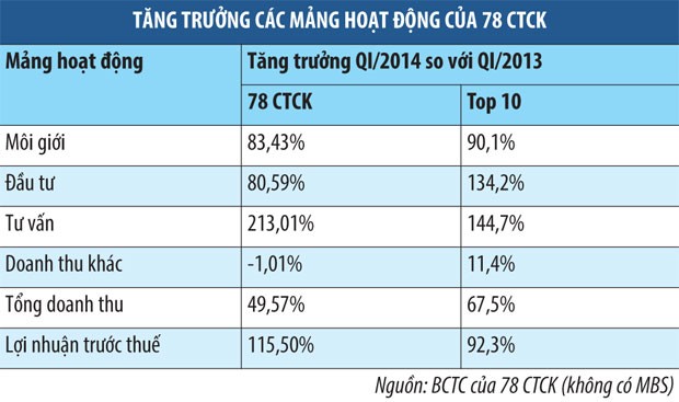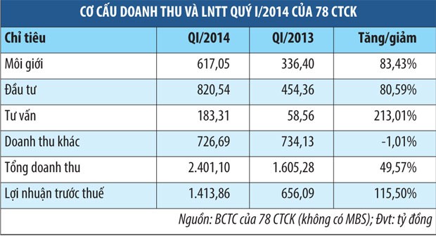 Không tính trường hợp của CTCK MB (MBS) do sáp nhập với VIT, 78 CTCK còn lại có doanh thu môi giới quý I đạt 617 tỷ đồng, tăng 83,4%; doanh thu hoạt động đầu tư 820,5 tỷ đồng, tăng 80,6%; doanh thu tư vấn 183,3 tỷ đồng, tăng gấp hơn 3 lần cùng kỳ năm 2013. Đặc biệt, lợi nhuận trước thuế tăng hơn gấp đôi và đạt gần 1.413,8 tỷ đồng.