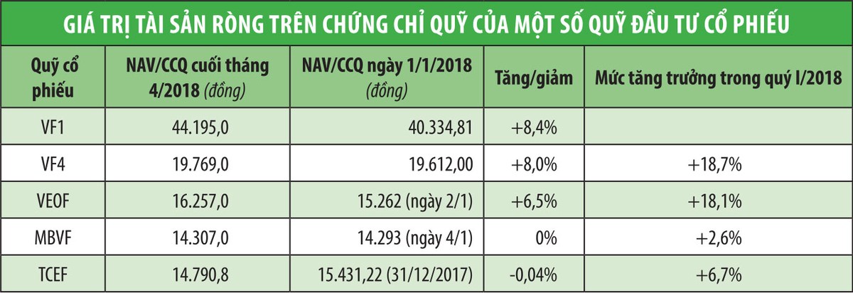 Trong 4 tháng đầu năm 2018, Quỹ đầu tư chứng khoán Việt Nam (VF1) và Quỹ đầu tư doanh nghiệp hàng đầu Việt Nam (VF4) ghi nhận mức tăng trưởng giá trị tài sản ròng trên mỗi chứng chỉ quỹ (NAV/CCQ) lần lượt là 8,4% và 8% (trước đó, NAV/CCQ của VF4 tăng trưởng 18,7% trong quý I).