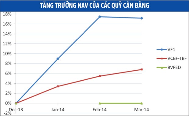 Quỹ cân bằng VCBF-TBF của Vietcombank Fund tăng được 6,33% NAV tính đến ngày 28/3, chưa bằng một nửa mức tăng của VF1. Tuy nhiên, quỹ mở mới khai trương này của Vietcombank Fund lại đang chào bán tương đối tốt đến các nhà đầu tư, khi mà lượng chứng chỉ quỹ đã tăng thêm gần 700.000 đơn vị trong vòng 3 tháng, nâng quy mô của Quỹ lên gần 72 tỷ đồng.