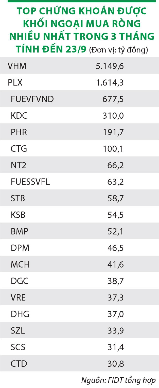 Trong 3 tháng gần nhất, những mã được khối ngoại ngoài mua mạnh là VHM, VNM, HPG, VCB, PLX, VRE, VIC, SAB, CTG, E1VFVN30, FUESSVFL. Tuy nhiên, nhiều mã trong số này cũng thuộc nhóm bị bán mạnh, cụ thể là VNM, HPG, VHM, VCB, VIC, SAB, bên cạnh đó là mã VRE, MSN. Tính chung, khối ngoại mua ròng VHM 5.149,6 tỷ đồng, PLX 1.614 tỷ đồng, FUEVFVND 677,5 tỷ đồng, KDC 310 tỷ đồng, E1VFVN30 gần 259 tỷ đồng…