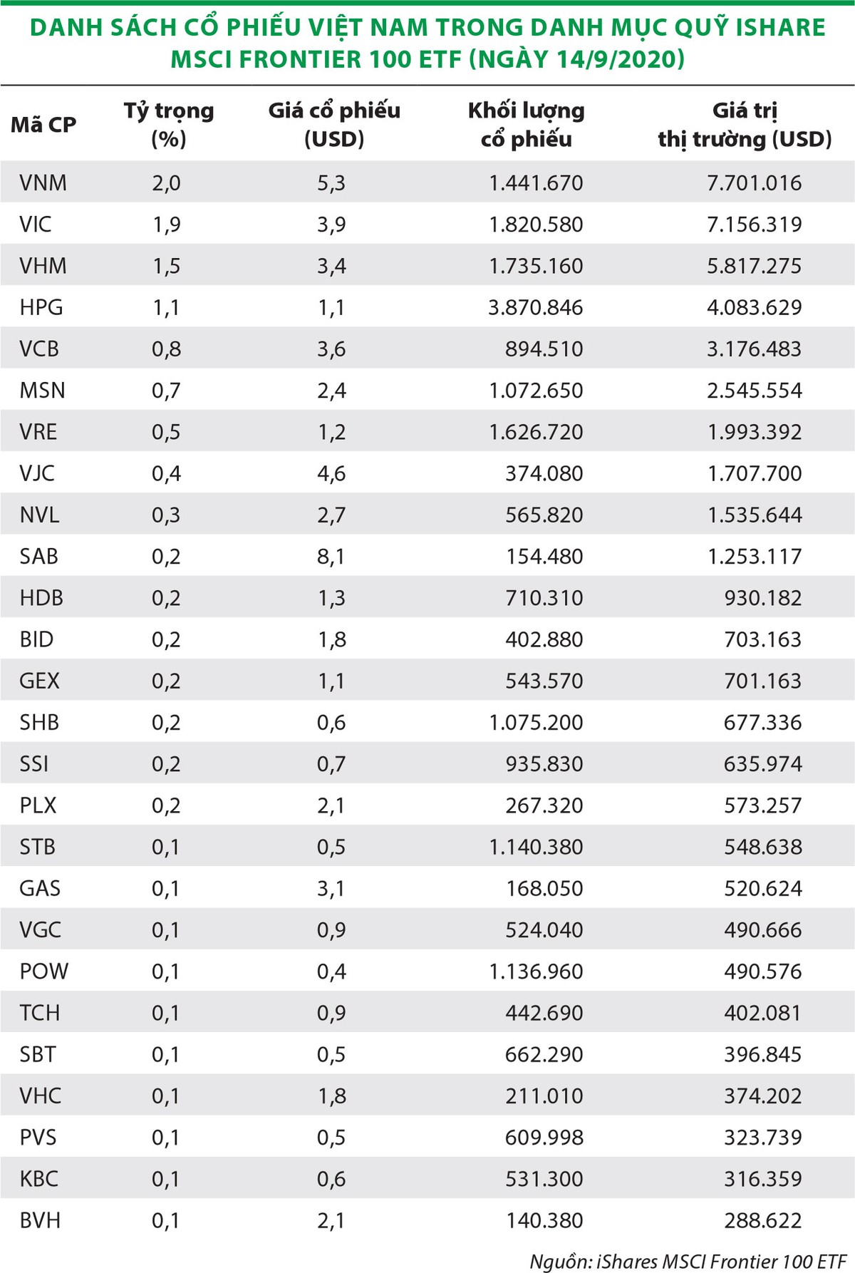 Theo đó, các cổ phiếu Việt Nam hiện có trong danh mục của MSCI Frontier Markets Index và MSCI Frontier Markets 100 Index sẽ được các quỹ ngoại theo dõi các chỉ số thị trường cận biên mua ròng sau khi Kuwait dự kiến được nâng hạng lên thị trường mới nổi vào tháng 11/2020, đặc biệt là các cổ phiếu vốn hóa lớn đang chiếm tỷ trọng cao như VNM, VIC, VHM, MSN, VRE, HPG, VCB.