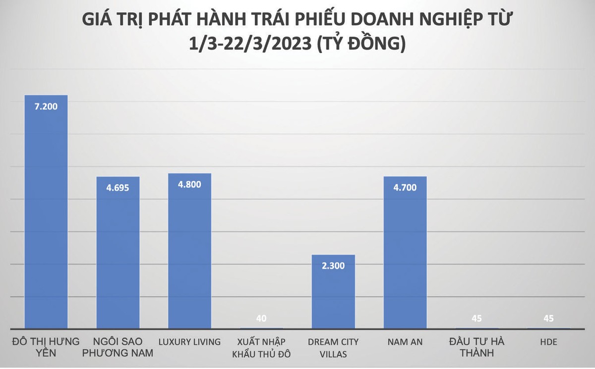Theo tìm hiểu của Báo Đầu tư Chứng khoán, các thương vụ phát hành trái phiếu có giá trị lớn trong nửa đầu tháng 3/2023 đều tới từ các doanh nghiệp hoạt động trong lĩnh vực bất động sản như Công ty TNHH Kinh doanh nội thất Luxury Living (4.800 tỷ đồng), Công ty cổ phần Đầu tư và kinh doanh Nam An (4.700 tỷ đồng), Công ty cổ phần Đầu tư kinh doanh và phát triển đô thị Ngôi Sao Phương Nam (4.695 tỷ đồng), Công ty TNHH Kinh doanh bất động sản Dream City Villas (2.300 tỷ đồng)...