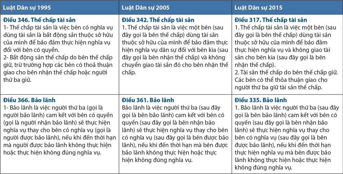 Có thể nói, khái niệm “thế chấp” và “bảo lãnh” theo các Bộ luật Dân sự 1995, 2005 và 2015 không thay đổi quá nhiều, ngoài trừ việc thay đổi từ ngữ như: từ “người” sang “bên”, mở rộng về đối tượng trong “thế chấp” từ “bất động sản” sang “tài sản”, thay đổi “bên có quyền” sang “bên kia”. Tuy nhiên, đến nay các giao dịch “thế chấp” và “bảo lãnh” vẫn có nhiều quan điểm khác nhau, tạo ra nhiều tranh luận gay gắt, thậm chí cả trong hoạt động xét xử các vụ tranh chấp tại tòa án.