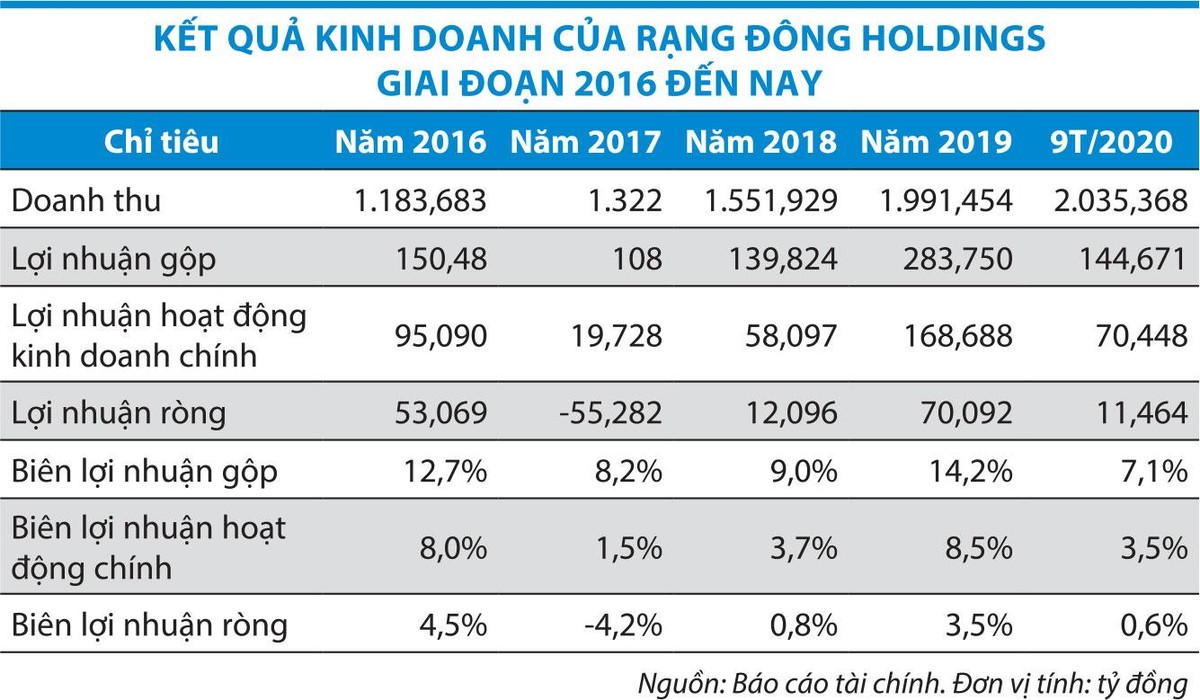 Mặc dù sở hữu khối tài sản lớn lên tới 2.687,5 tỷ đồng, thương hiệu 60 năm nhưng kết quả kinh doanh lại không tương xứng với tiềm năng của doanh nghiệp. Trong 9 tháng đầu năm 2020, Rạng Đông Holdings ghi nhận lợi nhuận 11,5 tỷ đồng, tỷ lệ lợi nhuận trên tổng tài sản (ROA) chỉ đạt 0,5%, thấp hơn nhiều so với các doanh nghiệp cùng ngành.