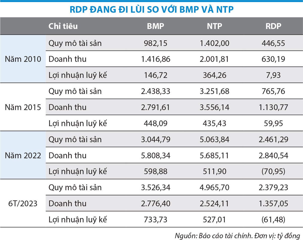 Kể từ năm 2016 tới nay, hoạt động kinh doanh của doanh nghiệp không có nhiều điểm sáng. Vì vậy, khoảng cách với các đối thủ cùng ngành như Nhựa Bình Minh, Nhựa Thiếu niên Tiền Phong ngày càng xa, từ quy mô tài sản cho tới hiệu quả kinh doanh. Tại thời điểm 30/6/2023, Nhựa Bình Minh (mã BMP) đang có lợi nhuận luỹ kế 733,73 tỷ đồng; Nhựa Thiếu niên Tiền Phong (mã NTP) đang ghi nhận lợi nhuận luỹ kế 527,01 tỷ đồng. Còn Rạng Đông Holding đang ghi nhận lỗ luỹ kế 61,48 tỷ đồng.