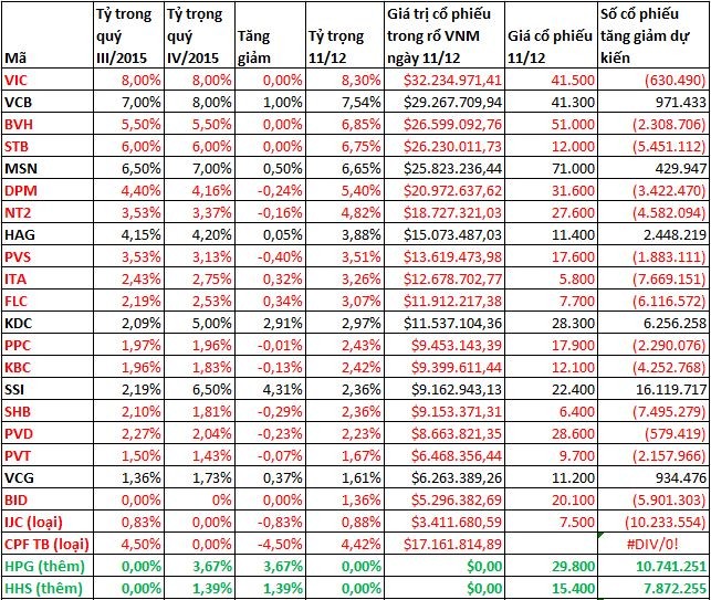 Với số liệu thực tế ngày 11/12/2015, tổng giá trị tài sản ròng của quỹ VNM đạt 388,3 triệu USD, tỷ trọng danh mục cổ phiếu Việt Nam đạt 80,33% như vậy VNM sẽ mua thêm khoảng 6,47 triệu USD các cổ phiếu Việt Nam. Với việc thêm mới hai cổ phiếu HPG và HHS khoảng 5,06% danh mục và bán ra cổ phiếu IJC (chiếm 0,88% danh mục), như vậy VNM sẽ phải bán bớt khoảng 9,75 triệu USD (219 tỷ đồng) tại các cổ phiếu Việt Nam khác để đảm bảo tỷ trọng cổ phiếu Việt Nam trong rổ đạt 82%.