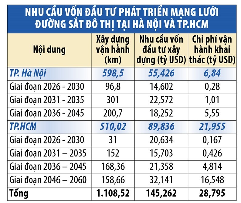 Tại Đề án Tổng thể đầu tư xây dựng hệ thống đường sắt đô thị tại Hà Nội và TP.HCM, Bộ GTVT ước tính, tổng nhu cầu vốn đầu tư phát triển mạng lưới đường sắt đô thị tại 2 thành phố vào năm 2035 là rất lớn, cần khoảng 174,06 tỷ USD, bao gồm 145,26 tỷ USD cho nhu cầu đầu tư, xây dựng và 28,8 tỷ USD cho vận hành khai thác.