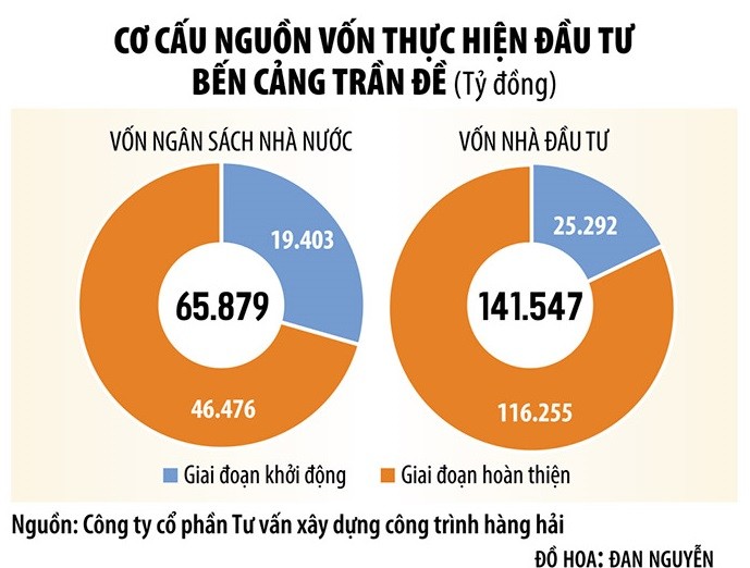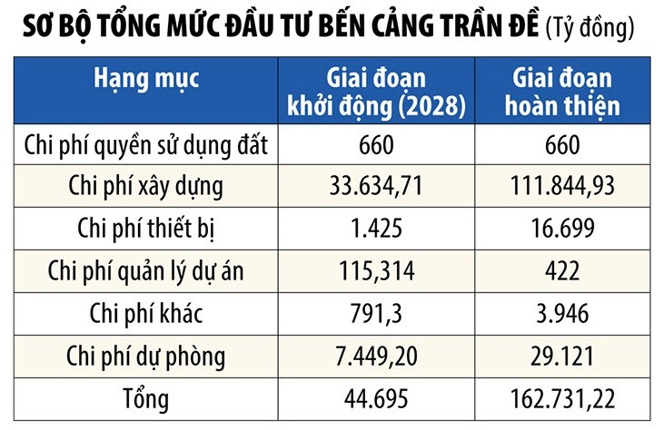 Đơn vị tư vấn cũng đề xuất chia Dự án thành 6 dự án thành phần, đồng thời kiến nghị xin hỗ trợ từ ngân sách nhà nước cho các hạng mục công trình cho 3 dự án thành phần gồm: Dự án thành phần số 2 xây dựng tuyến đường sau cảng dài 6,3 km kết nối từ bến cảng ngoài khơi cửa Trần Đề đến điểm cuối tuyến đường cao tốc Châu Đốc - Cần Thơ - Sóc Trăng; Dự án thành phần số 3 xây dựng cầu vượt biển nối đất liền với bến cảng ngoài khơi; Dự án thành phần số 4 xây dựng các tuyến đê chắn sóng đối với các bến cảng ngoài khơi; nạo vét tuyến luồng tàu vào bến cảng Trần Đề và các vũng quay tàu.