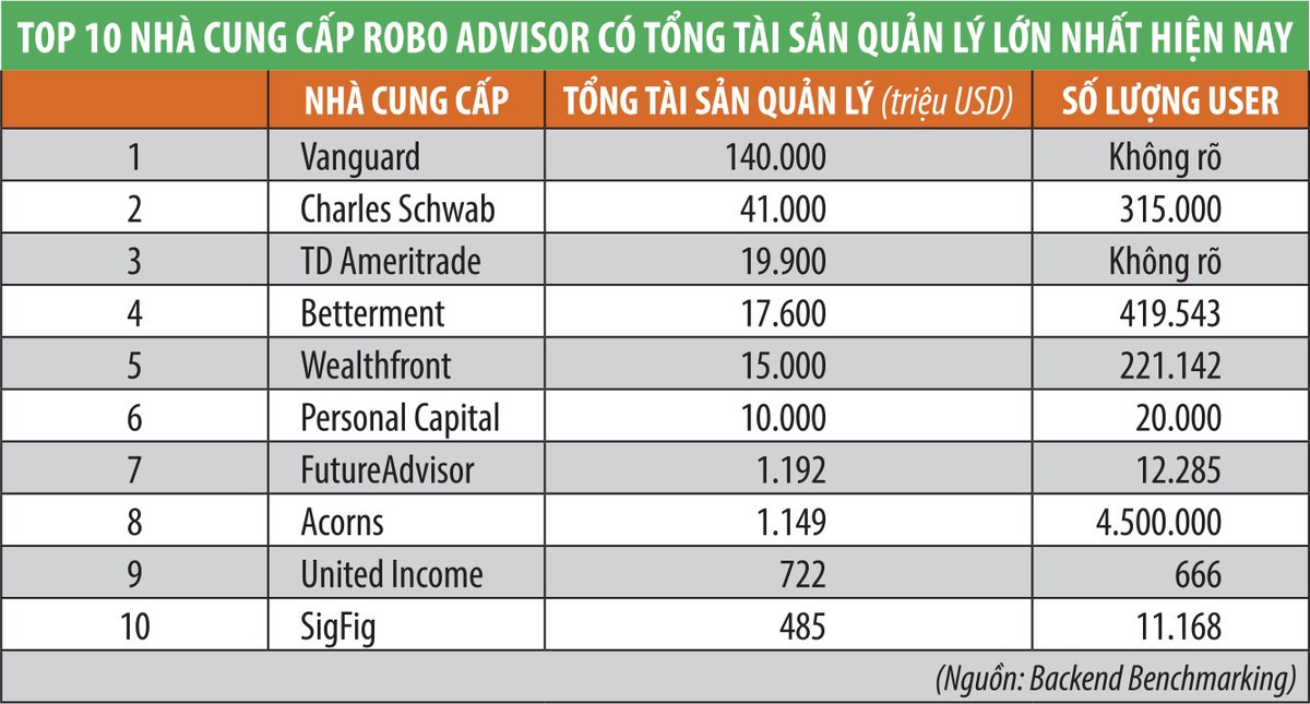 Theo hãng nghiên cứu Statista (Đức), năm 2019, các dịch vụ robo advisor dự kiến sẽ quản lý hơn 980 tỷ USD tài sản trên toàn thế giới, tăng 80,5% so với năm 2018.