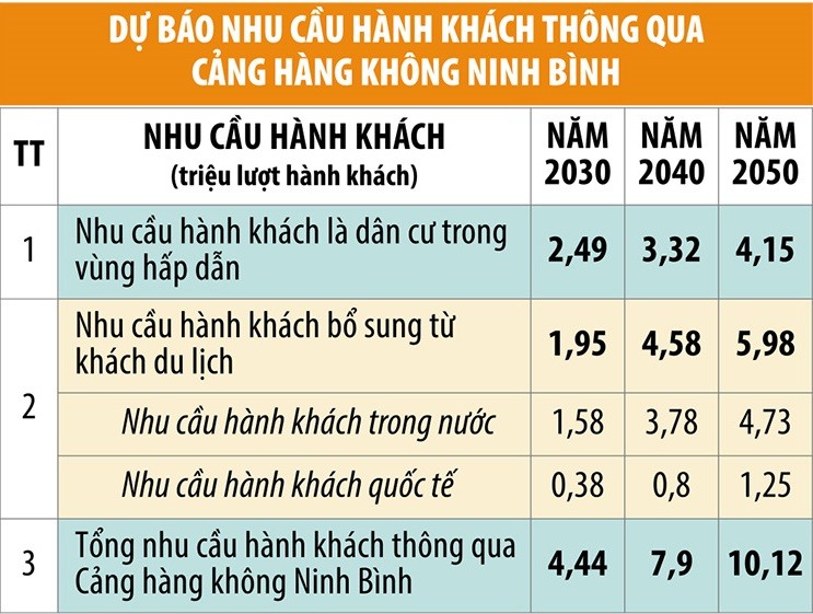 Theo đơn vị tư vấn lập Đề án, khi Cảng hàng không quốc tế Ninh Bình được đưa vào khai thác cuối năm 2027, sẽ thu hút lượng hành khách có nhu cầu đi/đến khu vực hấp dẫn thuộc tỉnh Ninh Bình mà trước đó sử dụng Cảng hàng không quốc tế Nội Bài.