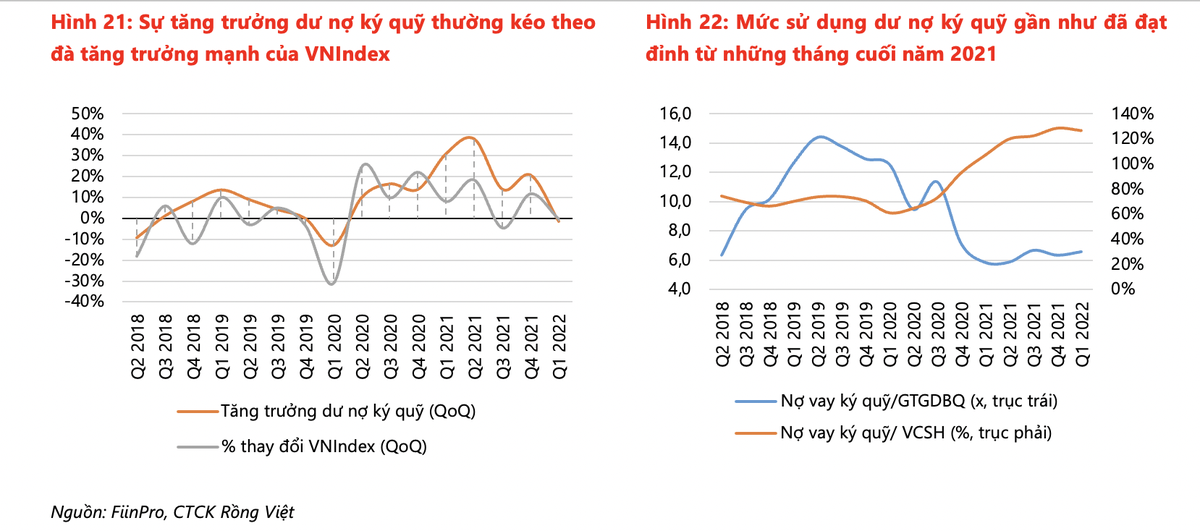 Chỉ số VN-Index đã rất khó khăn chinh phục ngưỡng điểm cao trong bối cảnh tỷ lệ sử dụng nợ vay ký quỹ gần như đã đạt đỉnh từ những tháng cuối năm 2021. Trong tháng 4 và 5, thị trường trải qua nhiều phiên giảm điểm mạnh với mức giảm từ xấp xỉ 1,5 - 2% đến xấp xỉ 4,7 – 4,8%.