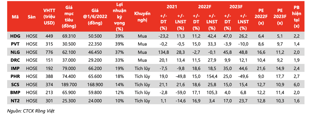 Do đó, Rồng Việt cho rằng cơ hội tích lũy những cổ phiếu có tỷ trọng lớn trong danh mục các quỹ ETF vẫn còn khả thi trong tháng này. Các cổ phiếu ưa thích là FPT, PNJ, vốn chiếm tỷ trọng đáng kể trong danh mục của quỹ ETF DCVFM VN Diamond với mức ~16% tại ngày 3/6/2022. Ngoài ra, đây cũng là những cổ phiếu được hỗ trợ bởi yếu tố triển vọng kết quả kinh doanh quý 2 và cả năm khả quan, giúp giảm thiểu rủi ro giảm giá khi quỹ này bị rút vốn.