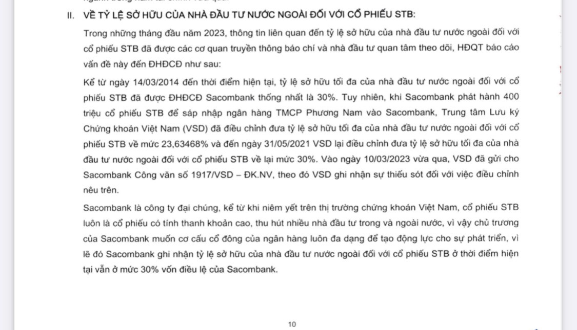 Vào ngày 10/3/2023 vừa qua, VSD đã gửi cho Sacombank công văn, theo đó VSD đã ghi nhận sự thiếu sót đối với việc điều chỉnh nêu trên. Thông tin từ Sacombank đã chính thức khép lại tranh cãi về tỷ lệ sở hữu khối ngoại tại ngân hàng trong thời gian qua.