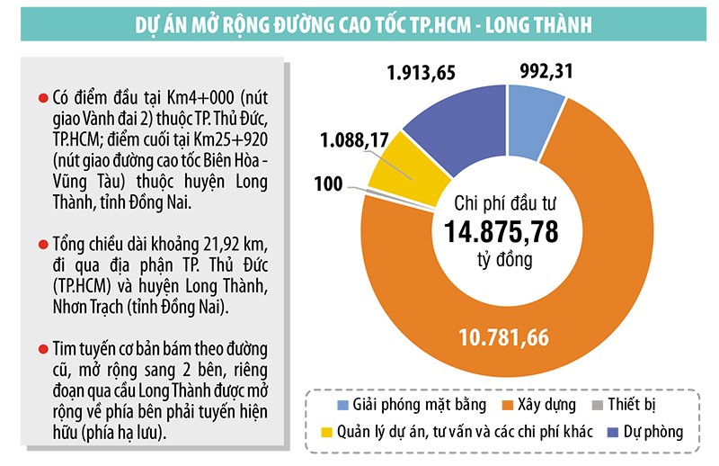Được biết, đơn vị đang được giao lập Báo cáo nghiên cứu tiền khả thi Dự án là Ban Quản lý dự án 7 đã đăng ký kế hoạch vốn cho Dự án Mở rộng đuờng cao tốc TP.HCM - Long Thành với Bộ Xây dựng. Với tổng mức đầu tư khoảng 14.875 tỷ đồng, Ban Quản lý đăng ký nhu cầu vốn cho Dự án trong năm 2025 là 2.500 tỷ đồng và năm 2026 là 12.375 tỷ đồng. Lãnh đạo Ban Quản lý cho biết, kế hoạch vốn này cơ bản khớp với tiến độ hoàn thành Dự án.