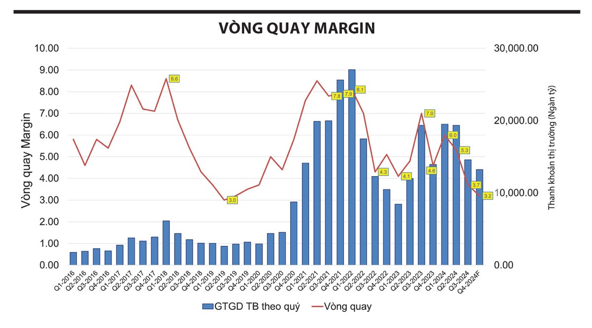 Sự tăng trưởng dư nợ ký quỹ ngày càng bất thường, có thể thấy qua tương quan giữa lượng margin tăng thêm và giá trị giao dịch. Kể từ sau đỉnh thị trường năm 2022, thanh khoản khớp lệnh của thị trường đã vơi đi phân nửa. Từ những phiên giao dịch tỷ đô trong năm 2022, giá trị khớp lệnh bình quân phiên trên HOSE trong 2 tháng đầu quý IV/2024 chỉ đạt khoảng 13.000 tỷ đồng, cá biệt có những phiên dưới 10.000 tỷ đồng. Nhưng lượng margin vẫn tăng mạnh và vượt xa con số ở giai đoạn VN-Index lập đỉnh 1.500 điểm.