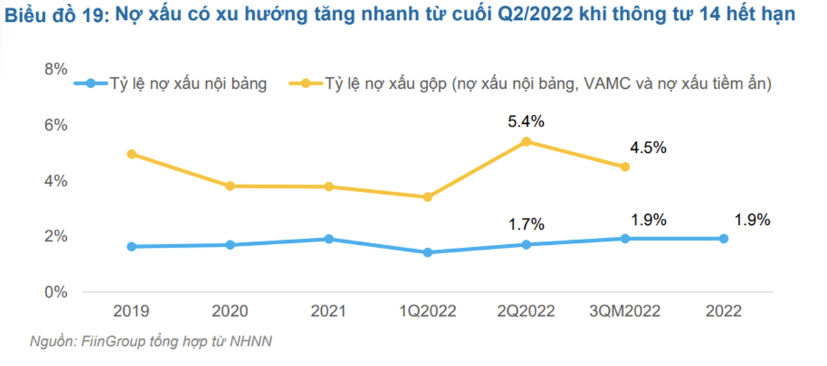 Theo bà Trần Kiều Oanh, Trưởng phòng Khối Phân tích Định chế Tài chính thuộc FiinGroup, chất lượng tín dụng đang đi xuống ở nhiều ngành, nợ xấu dần lộ diện kể từ khi Thông tư 14/2021/TT-NHNN của Ngân hàng Nhà nước hết hiệu lực từ cuối tháng 6/2022. Cuối năm 2022, tỷ lệ nợ xấu nội bảng đã tăng lên 1,92%, tỷ lệ nợ xấu gộp khoảng 4,5%.