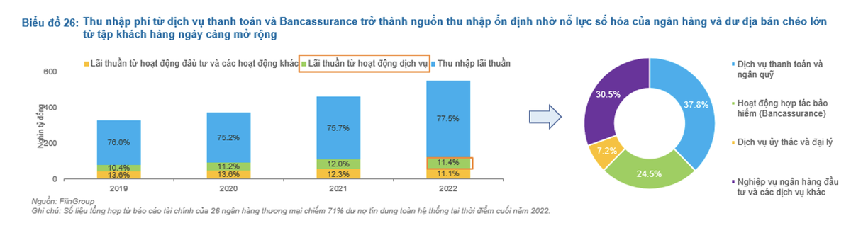FiinGroup ước tính, trong 63,1 nghìn tỷ lãi thuần từ hoạt động dịch vụ đóng góp bởi 26 ngân hàng thương mại chiếm 71% dư nợ tín dụng toàn hệ thống, gần 38% đến từ dịch vụ thanh toán và ký quỹ, 24,5% đến từ hoạt động hợp tác bảo hiểm Bancassurance và 30,5% từ nghiệp vụ ngân hàng đầu tư và các dịch vụ khác.