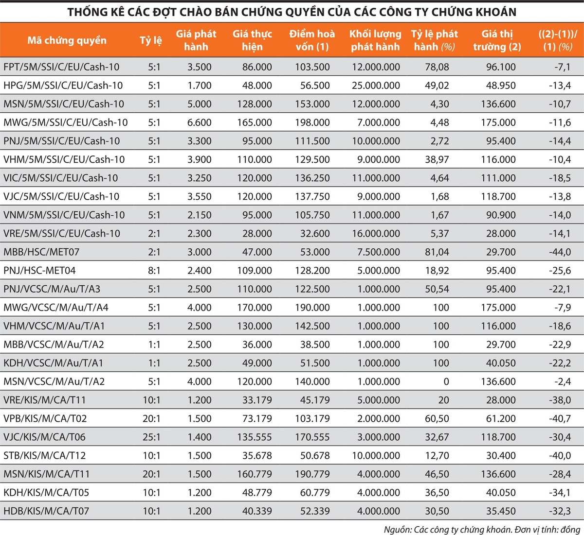 Mới đây, ba công ty chứng khoán gồm Chứng khoán SSI (SSI), Chứng khoán Bản Việt (VCSC) và Chứng khoán KIS Việt Nam (KIS) đã phát hành tổng cộng 23 mã chứng quyền với tỷ lệ chào bán thành công trung bình là 36,3% tổng lượng chào bán. Trong đó, SSI chào bán 10 mã chứng quyền, VCSC chào bán 6 mã và KIS chào bán 7 mã.