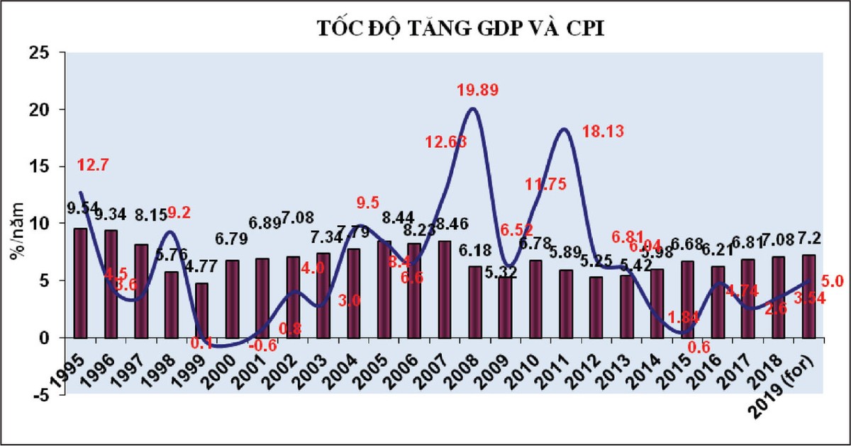 Thành công trong kiềm chế lạm phát cả năm dưới 4% suốt từ năm 2015 đến nay không những chứng tỏ nỗ lực ổn định kinh tế vĩ mô đã đạt kết quả, mà còn tạo cơ sở vững chắc để tăng trưởng kinh tế vượt mốc 6% và 7%. Dự báo tốc độ tăng trưởng GDP năm 2019 tiếp tục trên 7%; đồng thời CPI cả năm hoàn toàn có khả năng kiểm soát dưới 4% với điều kiện nhận diện và quản lý tốt rủi ro lạm phát đã tích lũy trong mấy năm qua, cũng như có thể xuất hiện trong thời gian tới.