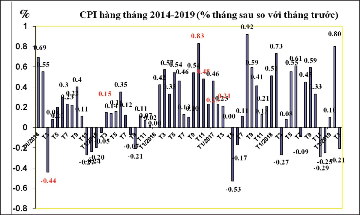 Sau tháng 1/2019, CPI gần như không thay đổi so với tháng trước, thì CPI tháng 2/2019 đã tăng mạnh tới 0,8% mặc dù chủ yếu do tăng giá dịp lễ Tết, nhưng việc CPI một tháng tăng cao như vậy là chưa hề xảy ra kể từ tháng 8/2017. Đóng góp tới 0,48% mức tăng của CPI tháng 2/2019 là do giá nhóm hàng ăn và dịch vụ tăng 1,73%, đặc biệt giá thực phẩm tăng tới 2,13%, trong đó giá thịt lợn tăng 3,14%, thịt bò tăng 2,84%, thuỷ sản tươi sống tăng 2,81% và thịt gia cầm tươi sống tăng 2,05%.