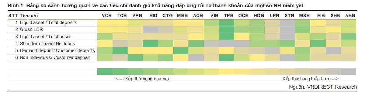 “Để giảm bớt ảnh hưởng của yếu tố thời điểm, chúng tôi lấy trung bình số liệu của các ngân hàng tại thời điểm cuối năm 2021 và cuối 30/6/2022. Đánh giá của chúng tôi chỉ dựa trên xếp hạng thứ tự của 17 ngân hàng theo từng tiêu chí. Lưu ý rằng, các mức xếp hạng thấp không có nghĩa là ngân hàng đó có rủi ro về thanh khoản”, Báo cáo của VNDirect nhấn mạnh.