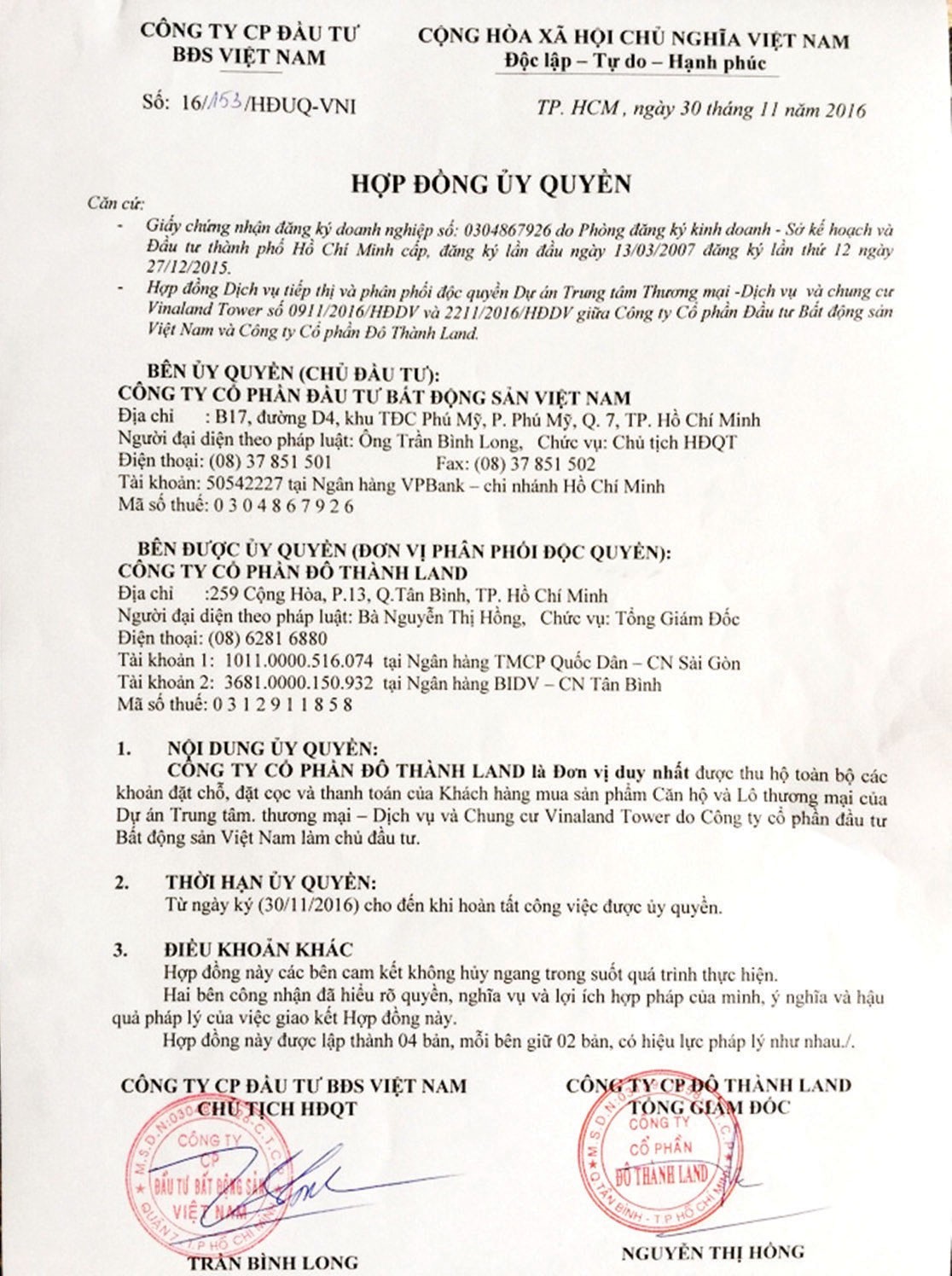 Hợp đồng ủy quyền giữa Vinaland và Thành Đô Land