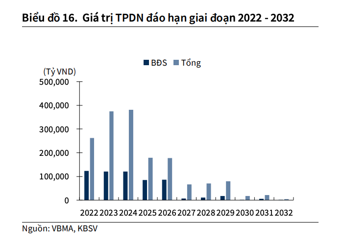 Việc các doanh nghiệp đẩy mạnh phát hành trái phiếu giai đoạn 2019 - 2021 làm gia tăng áp lực đáo hạn vào năm 2022 - 2026. Năm 2023 và 2024, tổng giá trị đáo hạn trái phiếu lần lượt đạt 374,3 nghìn tỷ đồng và 381,2 nghìn tỷ đồng. Trong đó, nhóm bất động sản chiếm tỷ trọng lớn thứ hai, lần lượt đạt 120,4 nghìn tỷ đồng (32,1%) và 121,1 nghìn tỷ đồng (32%).