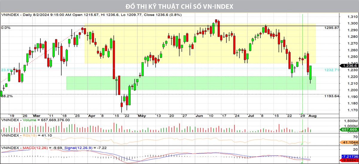 Dưới góc nhìn kỹ thuật, sau 6 phiên hồi phục trở lại ngưỡng 1.250 điểm thì áp lực bán xuất hiện và một lần nữa đẩy VN-Index về kiểm định vùng hỗ trợ 1.200 - 1.220 điểm (MA200). Đây là lần thứ hai, chỉ số cần đến ngưỡng hỗ trợ này trong 2 tuần qua, cho thấy lượng cổ phiếu được tích tụ sau những phiên hồi phục được cung ra thị trường. Trước mắt, vùng hỗ trợ 1.200 - 1.220 điểm đang cho thấy phản ứng tích cực, thị trường hồi phục trong phiên cuối tuần, nhưng điều này chưa xác nhận cho việc tạo đáy ngắn hạn của chỉ số chung. Theo đó, đây là ngưỡng điểm cần phải theo dõi trong các phiên tới.