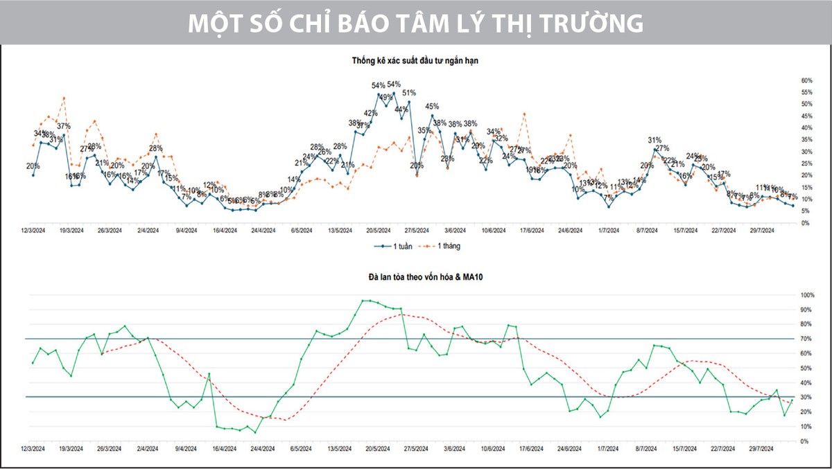 Diễn biến đi xuống của thị trường khiến nhiều vị thế ngắn hạn bị ảnh hưởng và xu thế đảo chiều giảm từ tháng 6 được xác nhận vẫn đang tiếp diễn. Thanh khoản ghi nhận cải thiện cho thấy lực cầu tăng, nhưng áp lực bán vẫn chưa giảm. Tình trạng thị trường này một phần do sự thận trọng của nhà đầu tư, thể hiện qua lực mua yếu dần, ngay cả trong những phiên chỉ số tăng điểm tốt dưới sự hỗ trợ của nhóm cổ phiếu vốn hóa lớn trong tuần trước. Dù nhiều doanh nghiệp công bố kết quả kinh doanh quý II/2024 tích cực, nhưng dòng tiền ngắn hạn chưa vội chảy vào thị trường và lực đẩy không đủ mạnh để duy trì đà tăng của chỉ số. Điều này khiến nhà đầu tư tiếp tục e ngại và thận trọng, thậm chí mất kiên nhẫn và bán cổ phiếu khi tài khoản dần bị bào mòn.