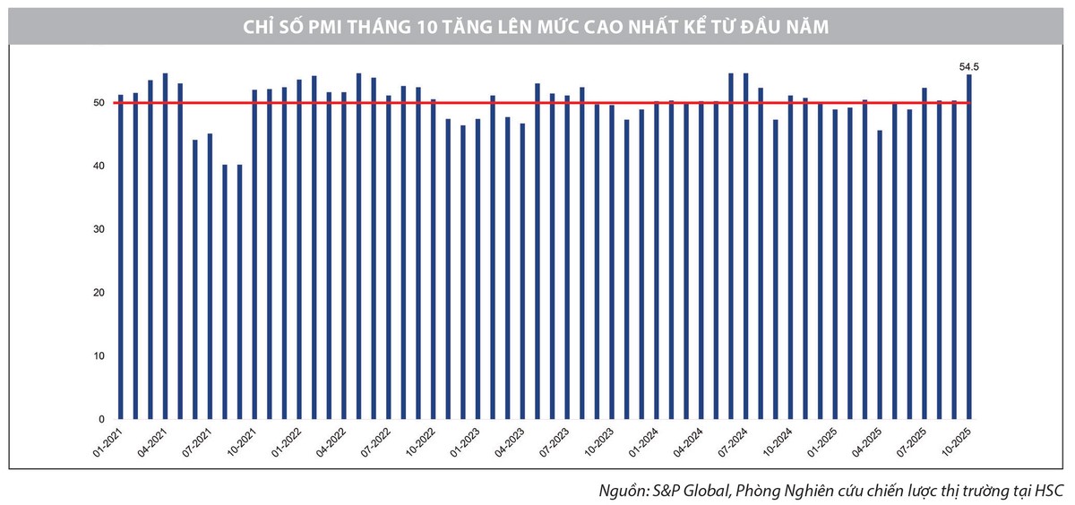 Bức tranh kinh tế tháng 10 ghi nhận nhiều điểm sáng quan trọng, cho thấy đà phục hồi của nền kinh tế đang lan tỏa mạnh mẽ sang cả khu vực sản xuất và đầu tư. Chỉ số Nhà quản trị mua hàng (PMI) ngành sản xuất tăng lên 54,5 điểm, phản ánh sự cải thiện đồng đều ở các cấu phần, bao gồm sản lượng, đơn hàng mới, việc làm, thời gian giao hàng và tồn kho.