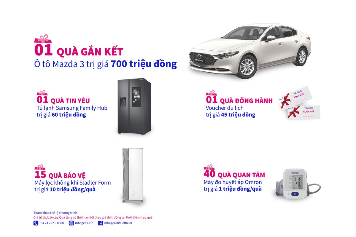 Theo đó, cứ mỗi 05 triệu từ Phí bảo hiểm năm đầu nộp trong thời gian khuyến mại, Quý khách sẽ nhận được 01 mã số may mắn và cơ hội trúng các giải thưởng hấp dẫn từ MB Ageas Life.
