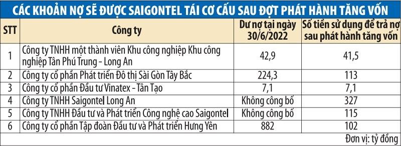 Gần 706 tỷ đồng còn lại sẽ được dùng để tái cơ cấu các khoản nợ vay thông qua trả nợ vay cho các công ty gồm: Công ty TNHH một thành viên Khu công nghiệp Tân Phú Trung - Long An (41,5 tỷ đồng), Công ty cổ phần Phát triển Đô thị Sài Gòn Tây Bắc (hơn 113 tỷ đồng), Công ty cổ phần Đầu tư Vinatex - Tân Tạo (7,1 tỷ đồng), Công ty TNHH Saigontel Long An (327 tỷ đồng), Công ty TNHH Đầu tư và Phát triển Công nghệ cao Saigontel (115 tỷ đồng), Công ty cổ phần Tập đoàn Đầu tư và Phát triển Hưng Yên (hơn 102 tỷ đồng).